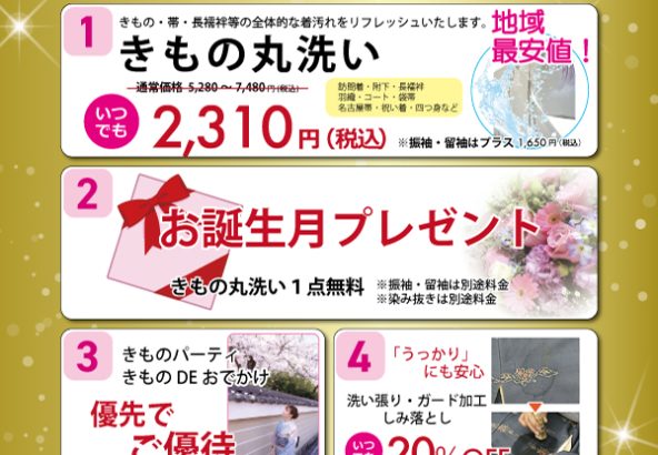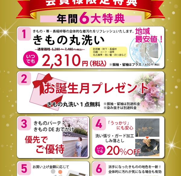 ①はなせメンバーズ会員の方には、きもの丸洗い(通常価格5,280円税込〜7,480円税込)特別価格でなんと 2,310円(税込)にてご提供させていただきます!(振袖、留袖はプラス1,650円(税込)) まだ、メンバー...